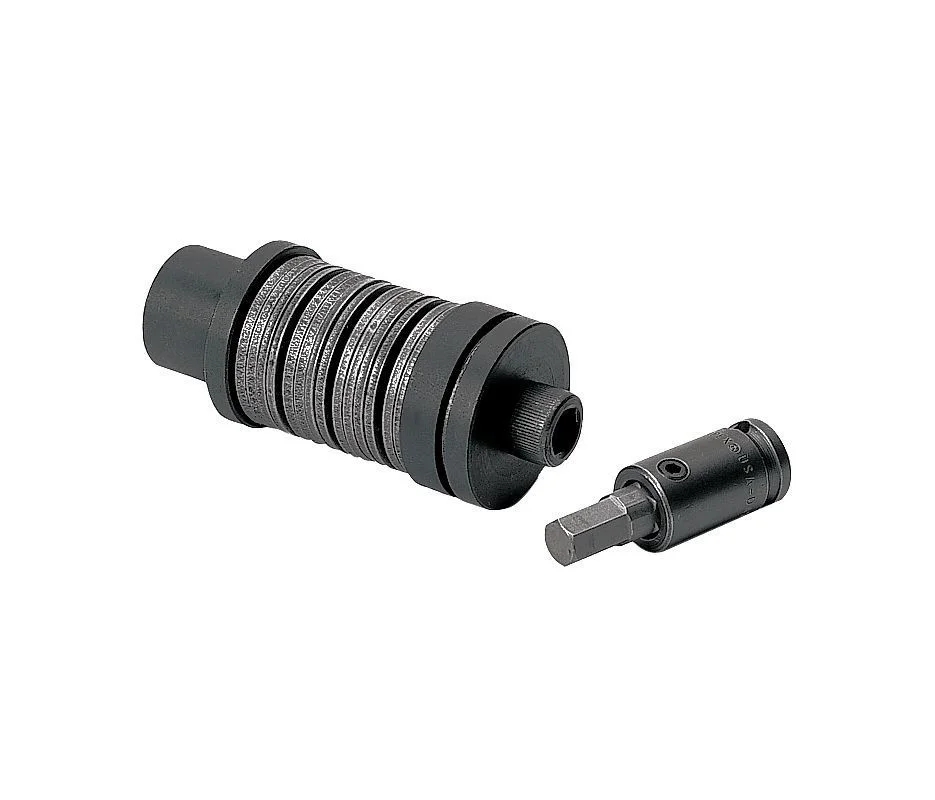 接头速率适配器放置在电子扭矩测试仪(ETT)的方形驱动器或CDI传感器的顶部,并用固定螺钉固定。将适配器头插入电动工具,并将其与接头速率适配器的顶部配合。通过以固定模式堆叠碟形垫圈,接头率适配器可以模拟软、中或硬接头。